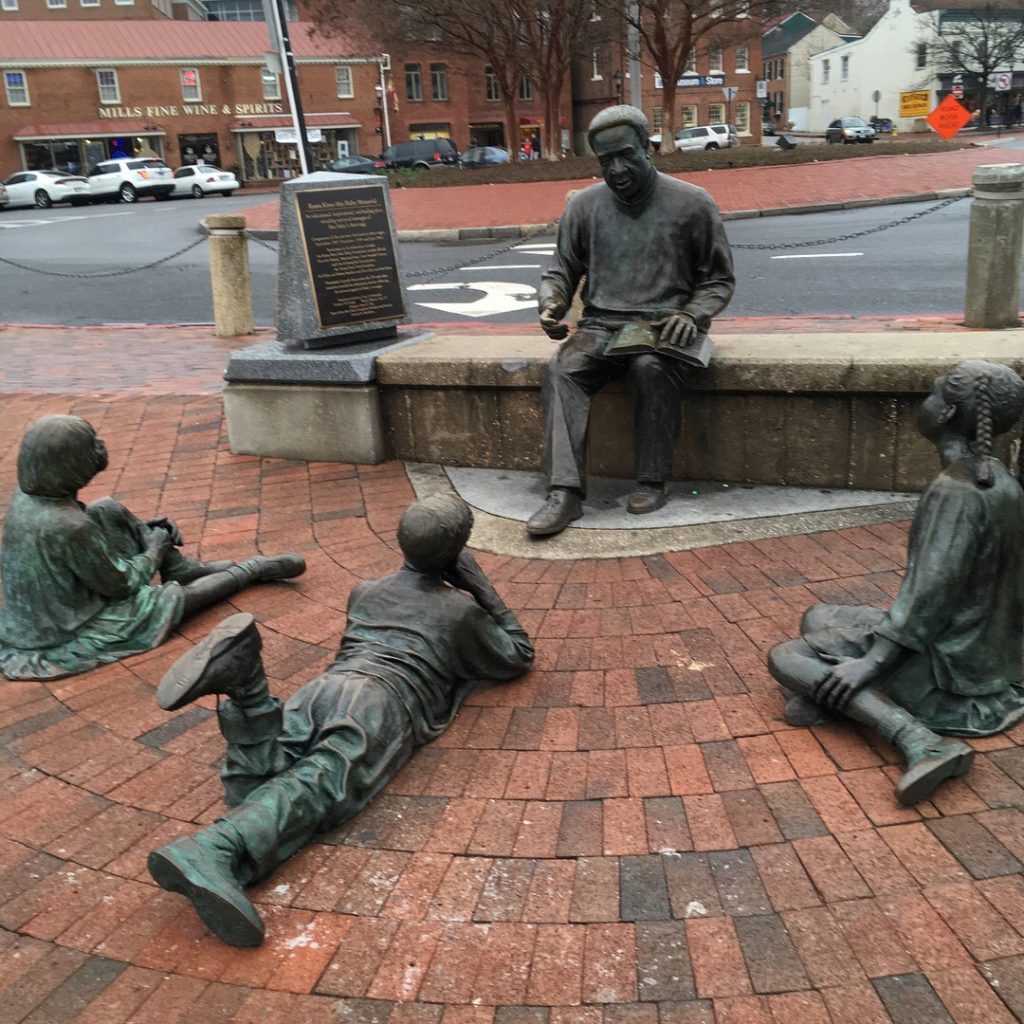 In 2002, a memorial was dedicated in the city dock section of Annapolis, Maryland, to mark the arrival of Kunta Kinte. Nearby is a memorial depicting Haley reading a story to young children gathered at his feet, which delighted me when we stumbled across it a few years ago. Just a simple scene, but it’s a powerful reminder that stories can change the world.